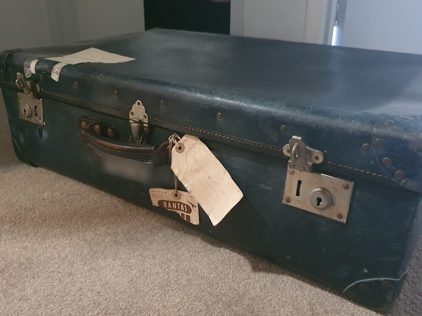 But that’s the flight Dr Pender’s navy suitcase would have taken. I’d guessed plastic, and I’d guessed the 1970s. I was applying ignorance and modern focus on plastics. From spots of wear and tear, I can see now the “plastic” case is made of a fibrous material, peeking out of the treated exterior. It was a deep-dive into suitcase history and materials, but I can say now that case is made of vulcanised fibre, a cotton-made-gelatinous-pressed-together material, and of the Oriental Make brand. It dates to the 40s or 50s, and it very well made the same trip I have done in an era vastly different from the one I know.